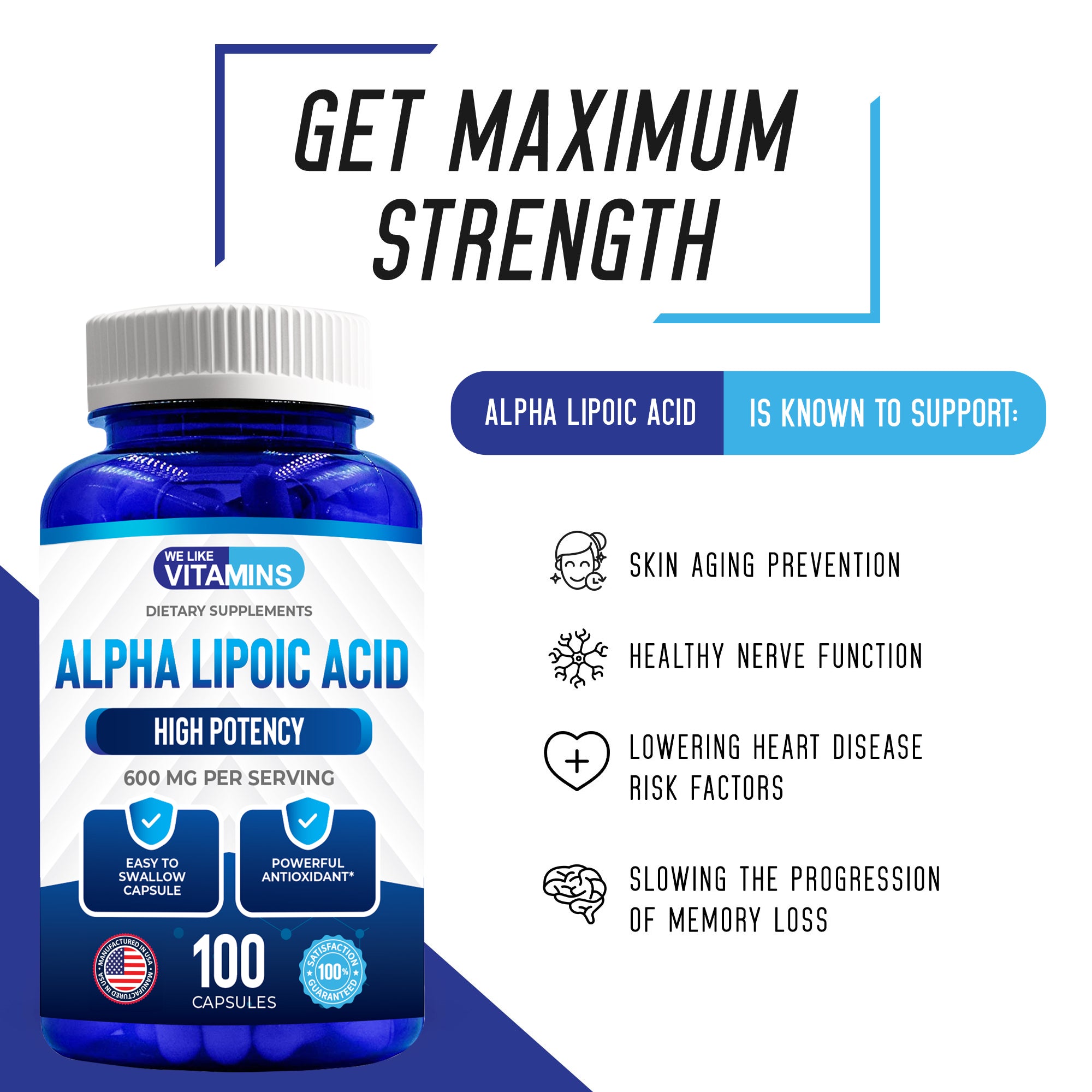 Alpha Lipoic Acid 600mg on Amazon -100 Capsules- 3 month supply – Each bottle contains 100 Capsules of Extra Strength Alpha Lipoic Acid for a full 100 day supply. Most others offer half the pills at half the strength.